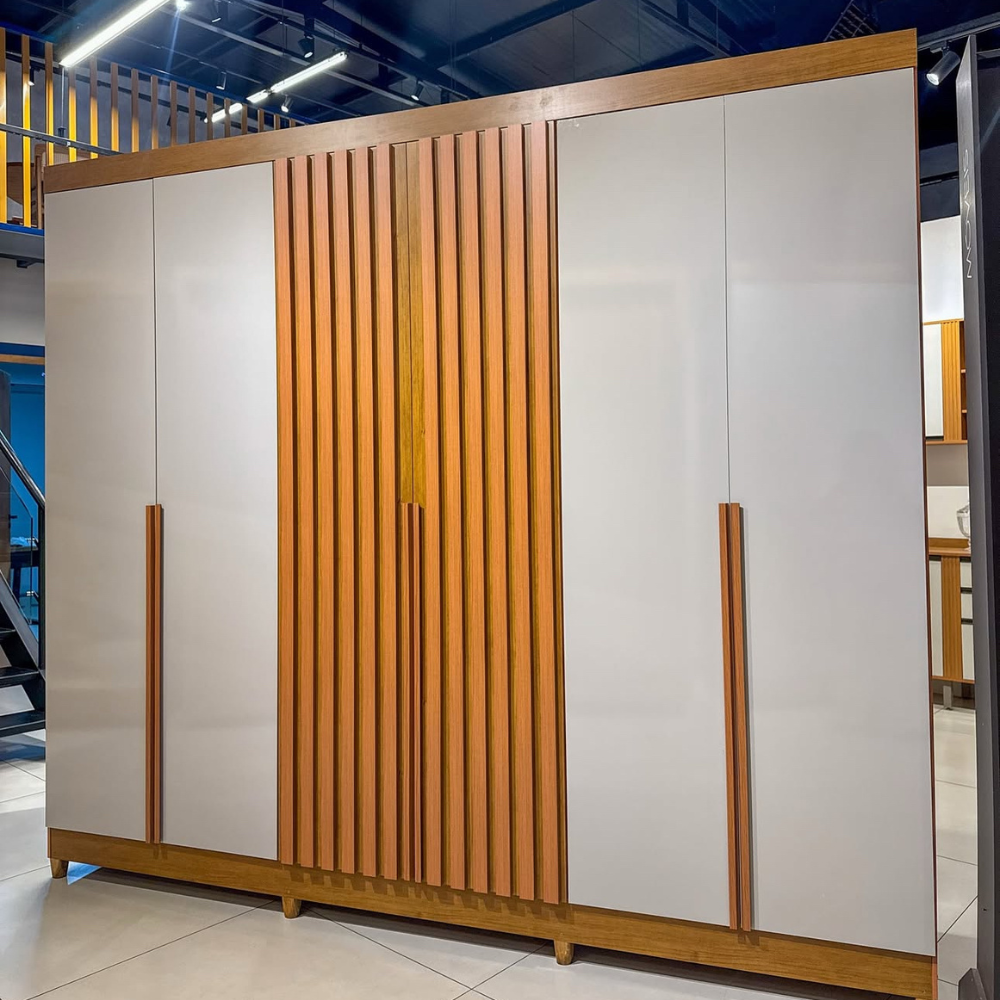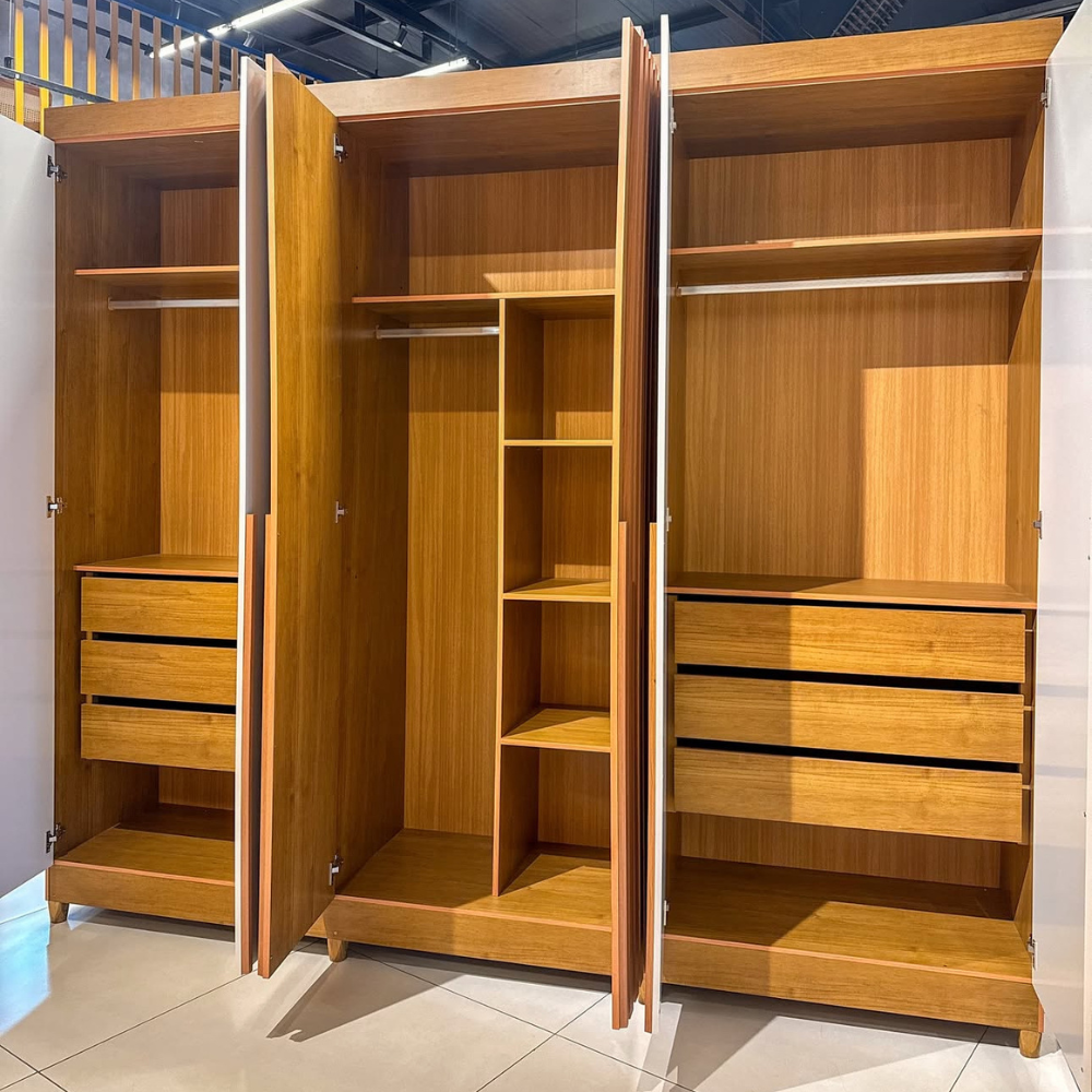 Este Guarda-roupa você vai amar! Possui divisões funcionais que possibilita uma melhor organização, ideal para dar o ar delicado e sofisticado para o ambiente que você merece! Fabricado em 100% MDF, sendo a estrutura em MDF de 15mm, laterais do roupeiro com encabeçamento de MDF de 25mm, 6 gavetas com corrediças telescópicas, amplo espaço interno para que você possa organizar seus pertences, roupas de cama, vestuários e calçados, possui 6 prateleiras internas, 3 cabideiros em alumínio, espaço para roupas longas, puxadores de madeira. Vamos deixar seu quarto muito mais charmoso!
