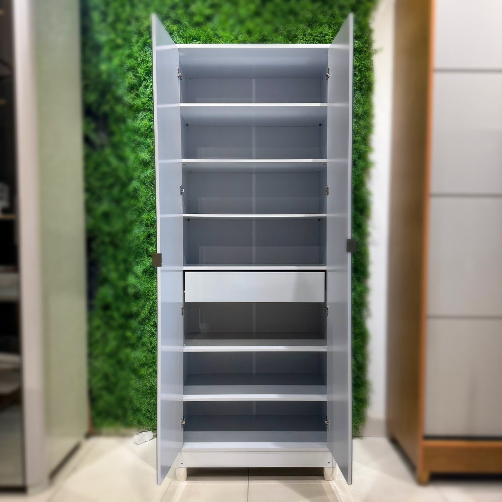 A sapateira Star é o móvel que embeleza e amplia o ambiente devido a grande área com espelhos das 2 portas, tem 5 prateleiras internas ideais para acomodação de vários pares de sapatos além de 1 gaveta interna para guardar pequenos pertences com deslize suave em corrediças telescópicas. Seus puxadores discretos em alumínio dão um toque de sofisticação ao produto. Para garantir a qualidade, possui estrutura em MDP resistente e revestimento em pintura UV que protege por mais tempo,